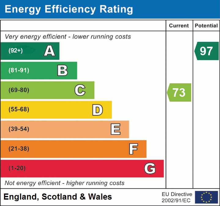 To the rear, a substantial Yorkstone patio terrace enjoys a desirable southerly aspect, making it an ideal space for outdoor dining and entertaining. The garden beyond is predominantly laid to lawn and is bordered on either side by mature hedging, with well stocked flower beds featuring a variety of shrubs and perennial planting that provide colour and interest throughout the seasons.